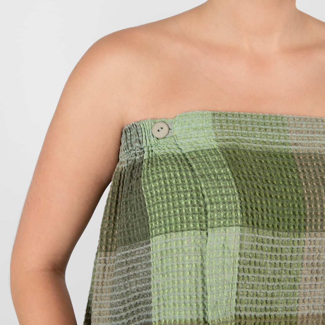 • linen green wrap towel with button closure.