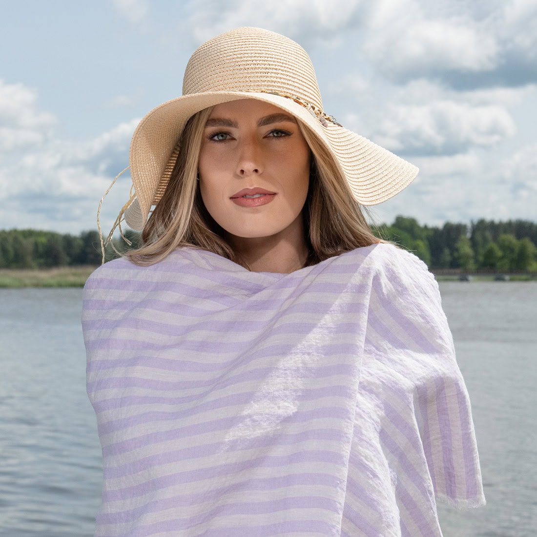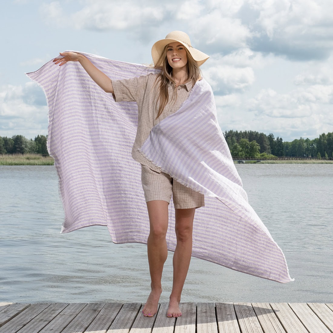• Linen beach towel in yellow and lilac stripes, 100% linen