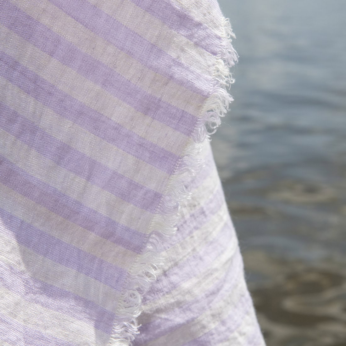 • Linen beach towel in yellow and lilac stripes, specially washed