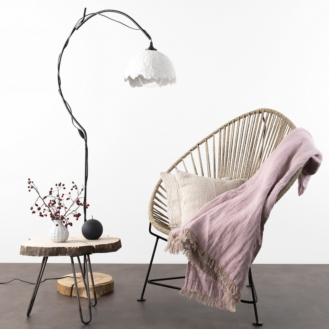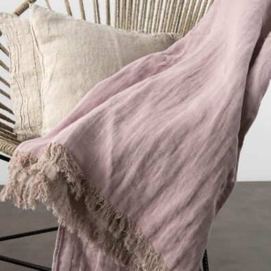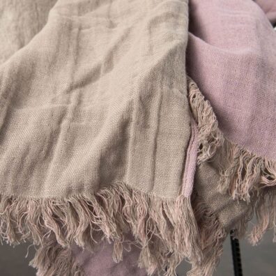 Double-sided linen / cotton blanket in greyish lilac and light grey, decorated with grey 5cm (2") long fringes on shorter sides. Any side of this blanket is perfectly suitable to lay over the bed or wrap yourself in. It has already been specially washed, therefore, it will not shrink after washing. If you're yearning for comfort and warmth, or you are looking for a lovely gift, this soft linen blanket is what you need.