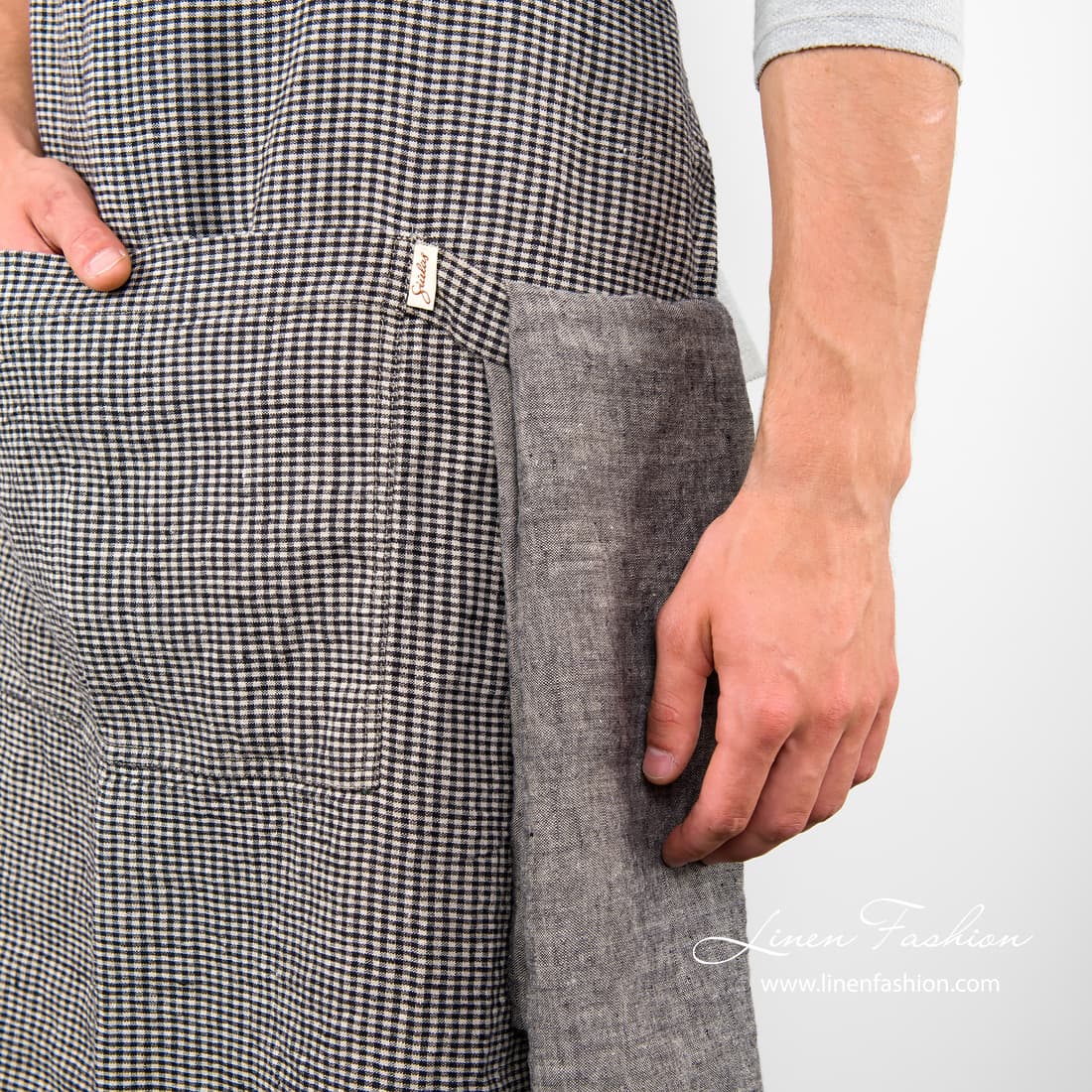 Linen apron with black / grey squares. Made with adjustable neck strap in natural grey linen fabric. Large comfortable pocket in front and loop for towel. The fabric of the product was specially washed which does not shrink.