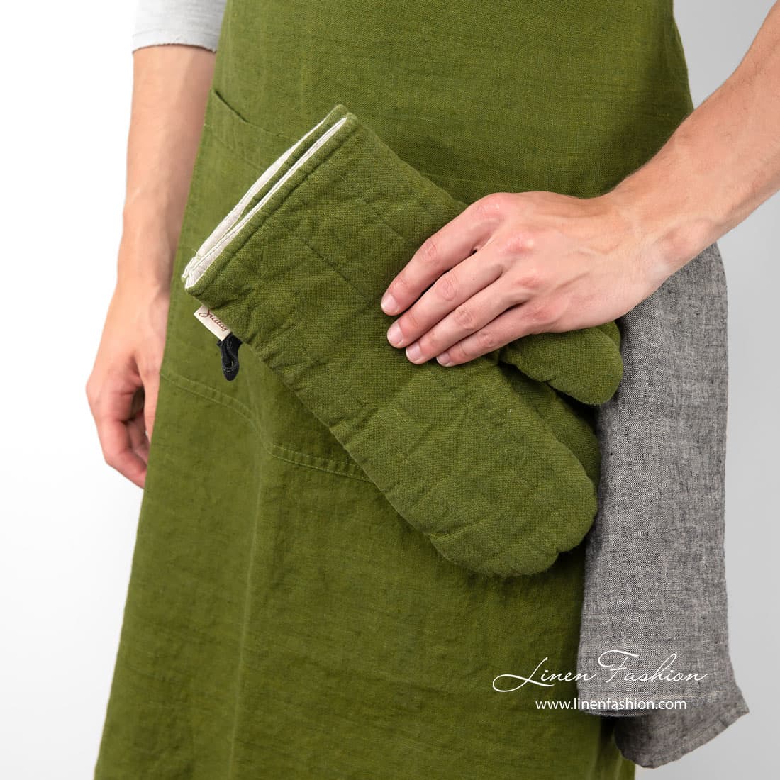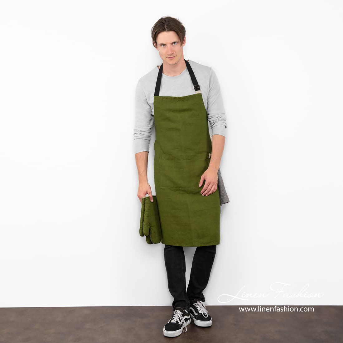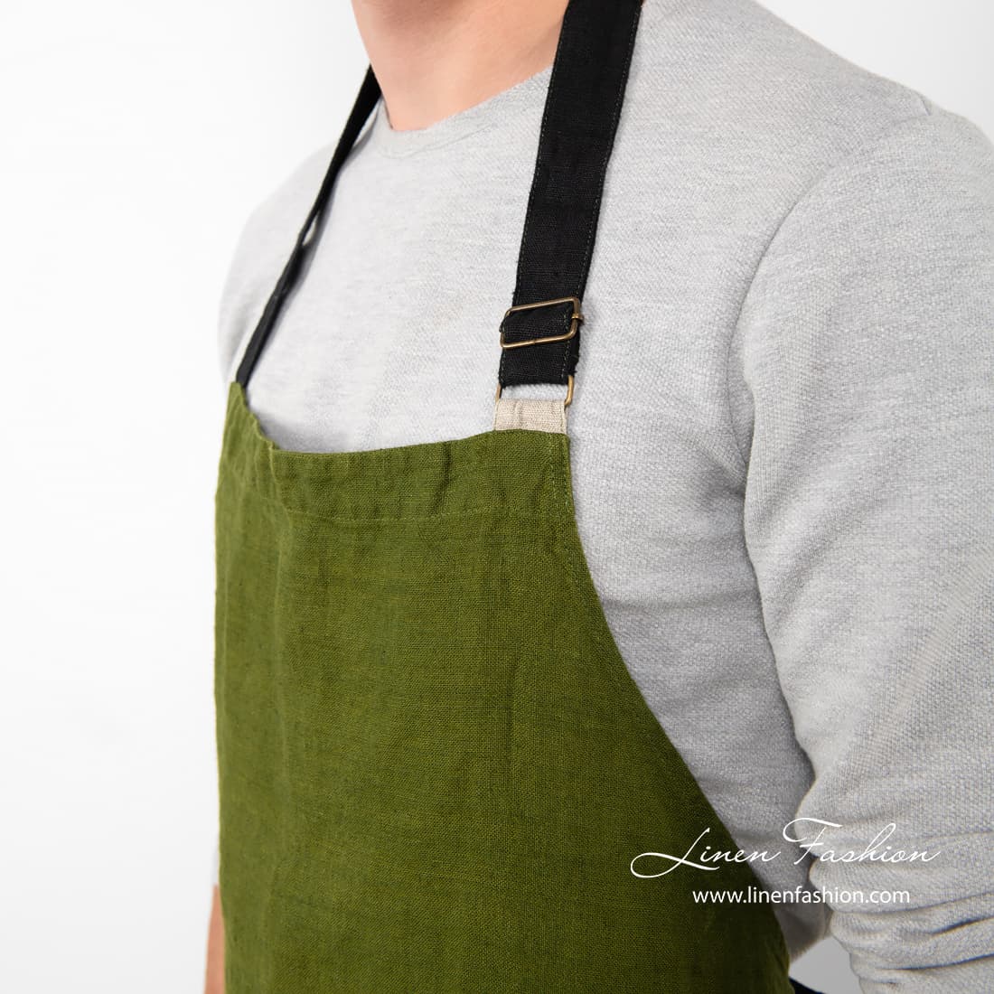 • Details: one large front pocket, adjustable black neck strap, loop for hanging towels on side