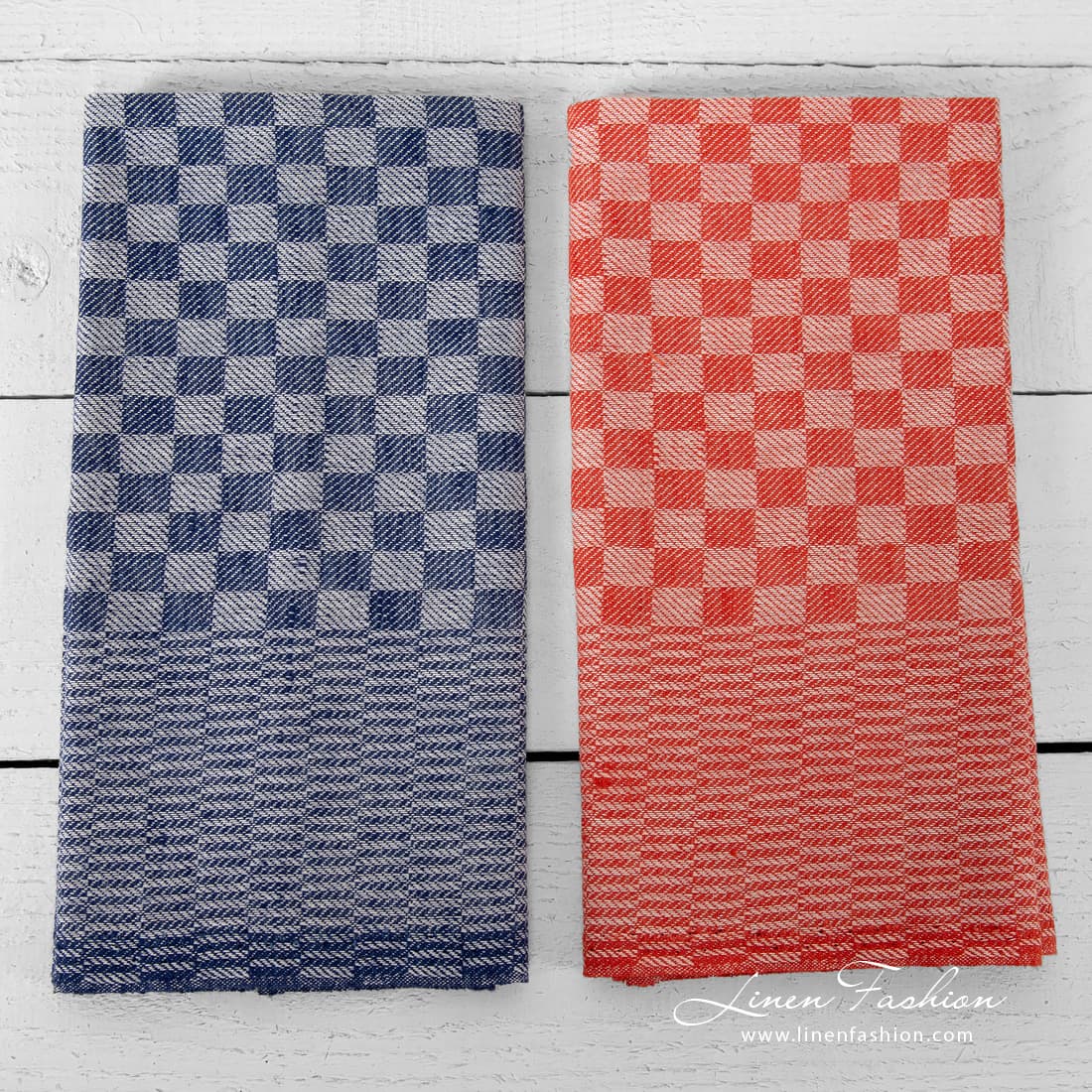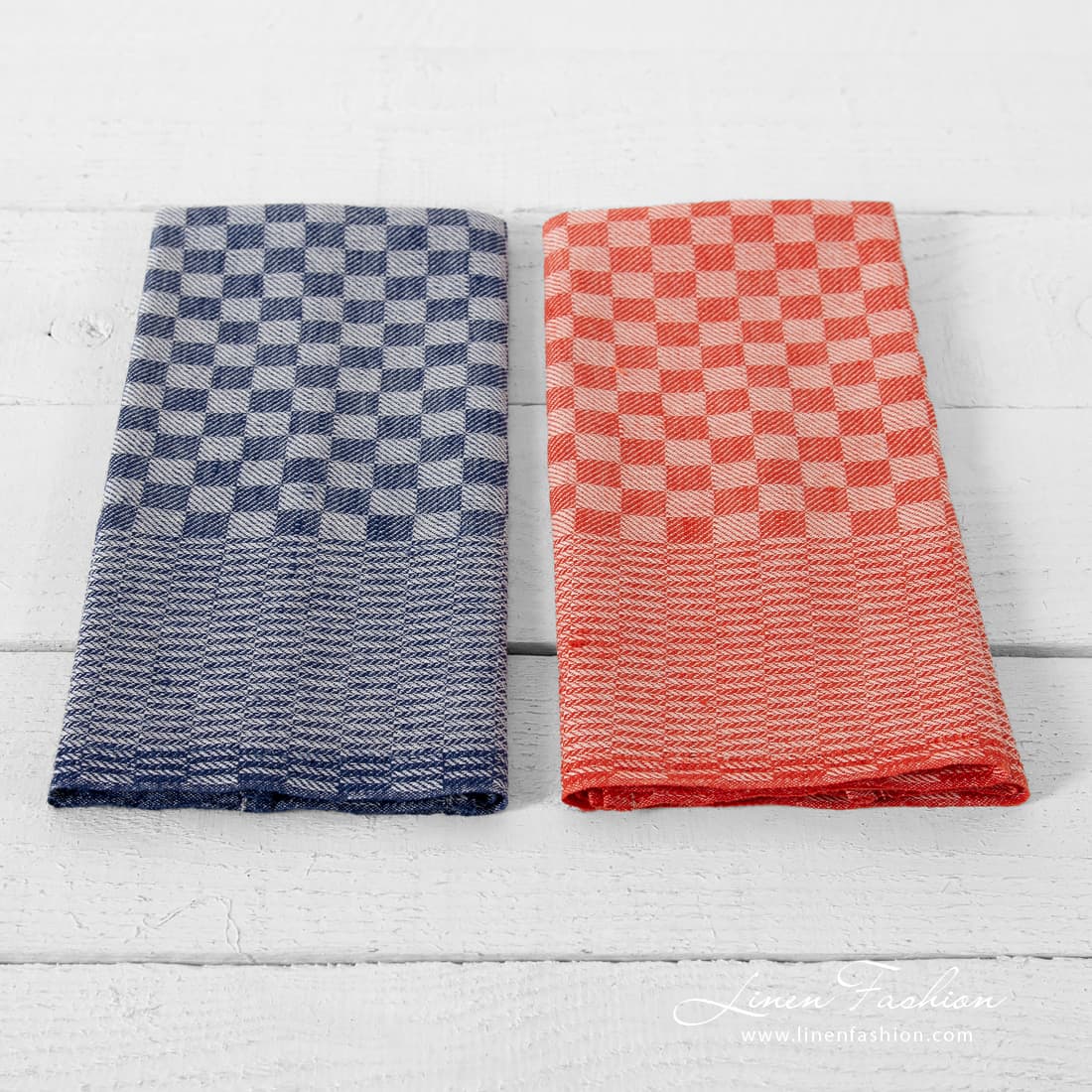 Linen cotton set of two twill weave checked pattern kitchen towels in red and navy colours. Made from dense, long lasting, highly absorbent linen blend fabric. Set comes tied with a string.