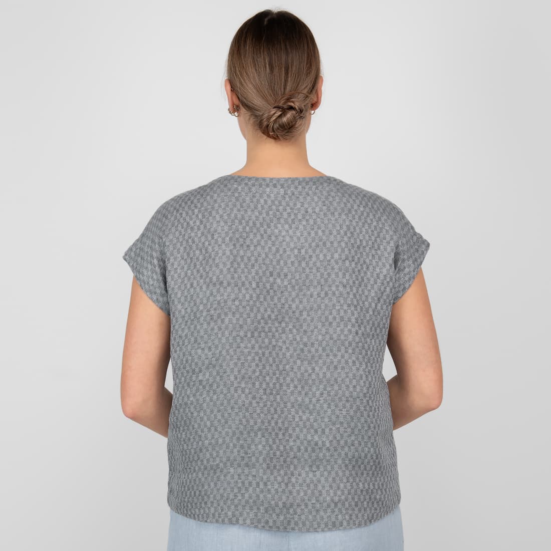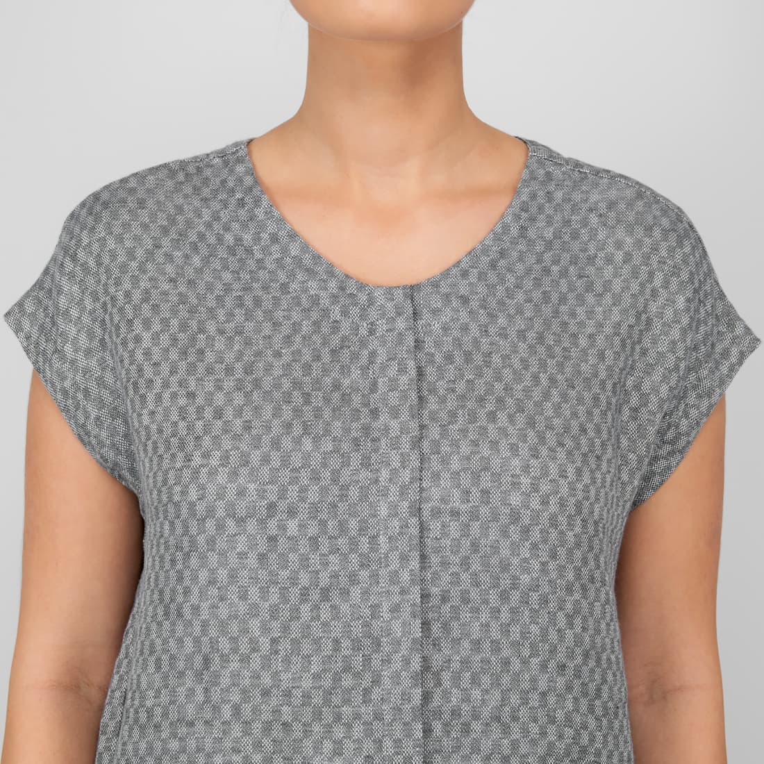 - Product model: straight loose silhouette, short sleeves, round neckline