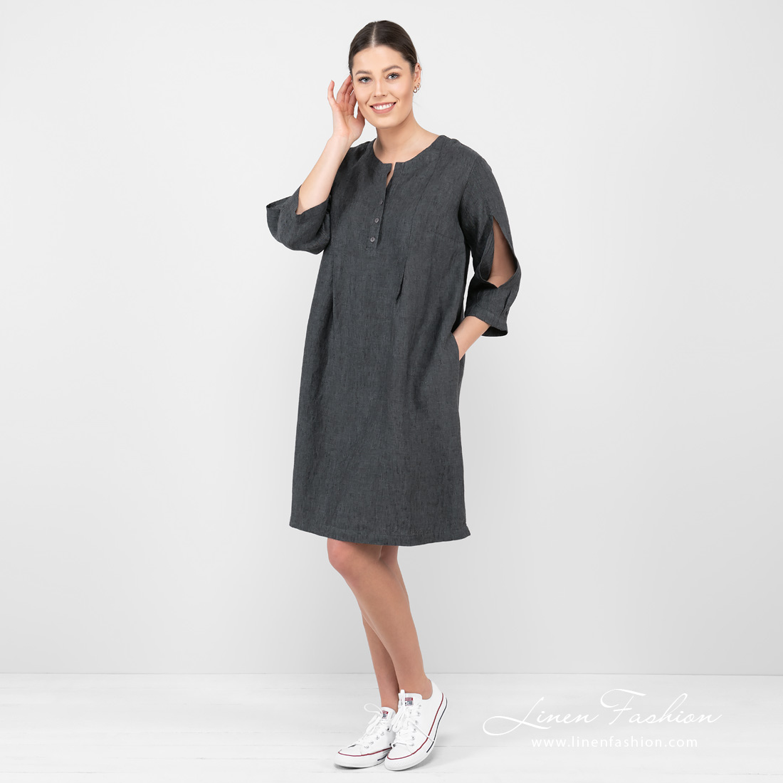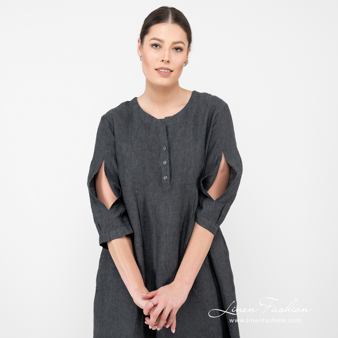 - Product model: loose silhouette, above-knee length, 3/4 sleeves with slits