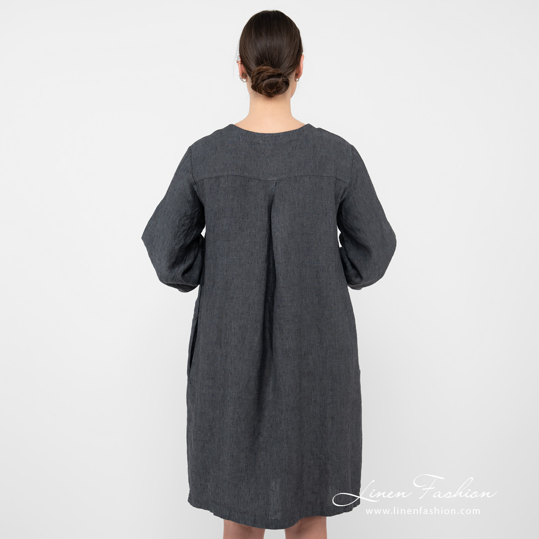 - Details: rounded neckline with button closure, fold at the back, pockets on sides