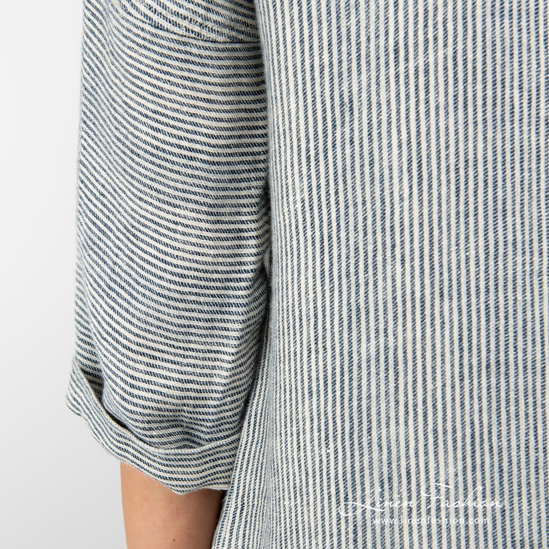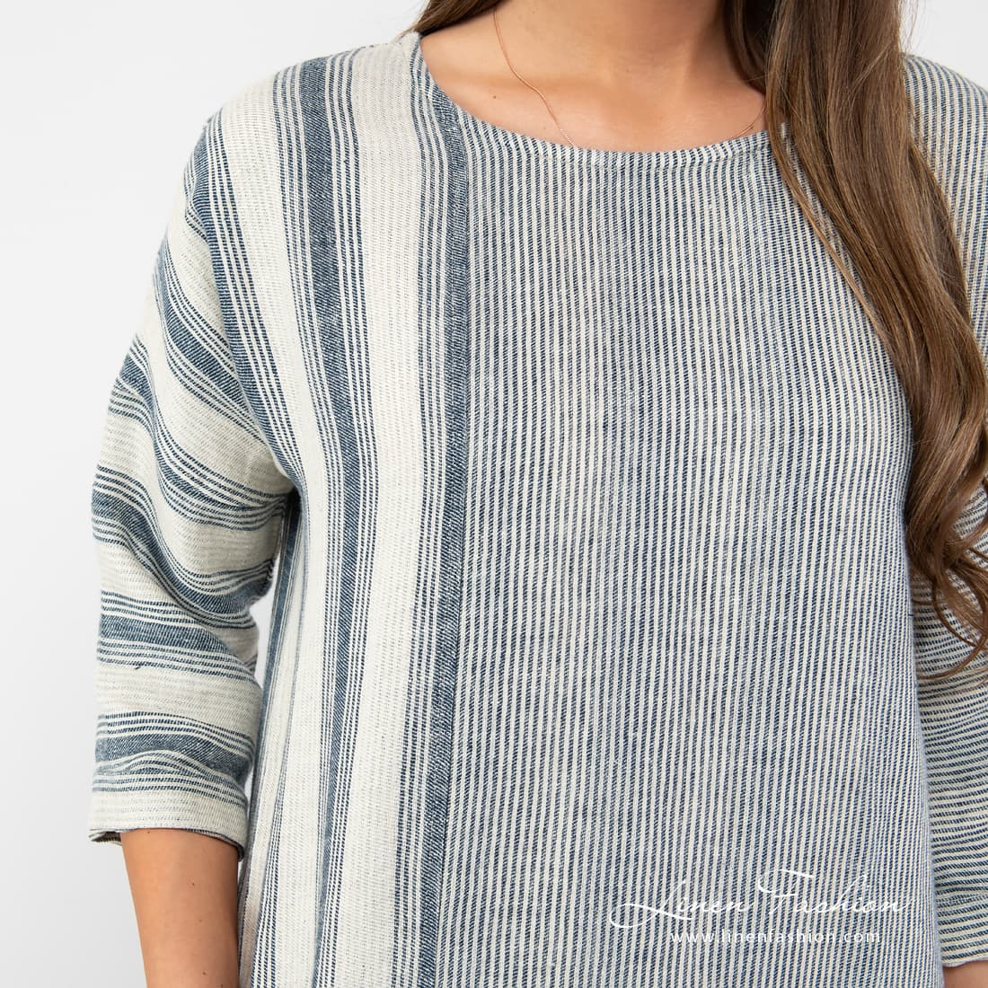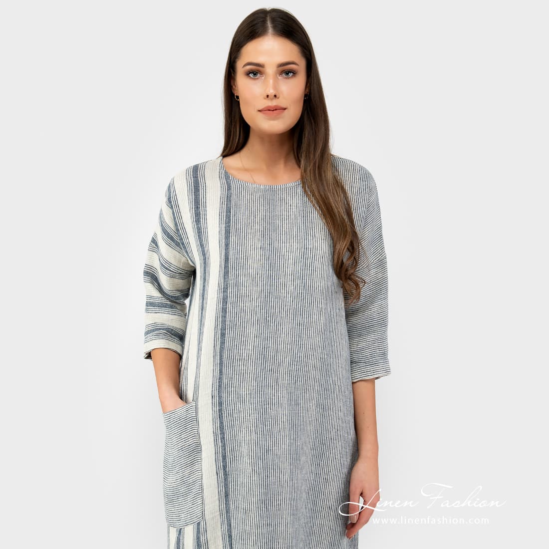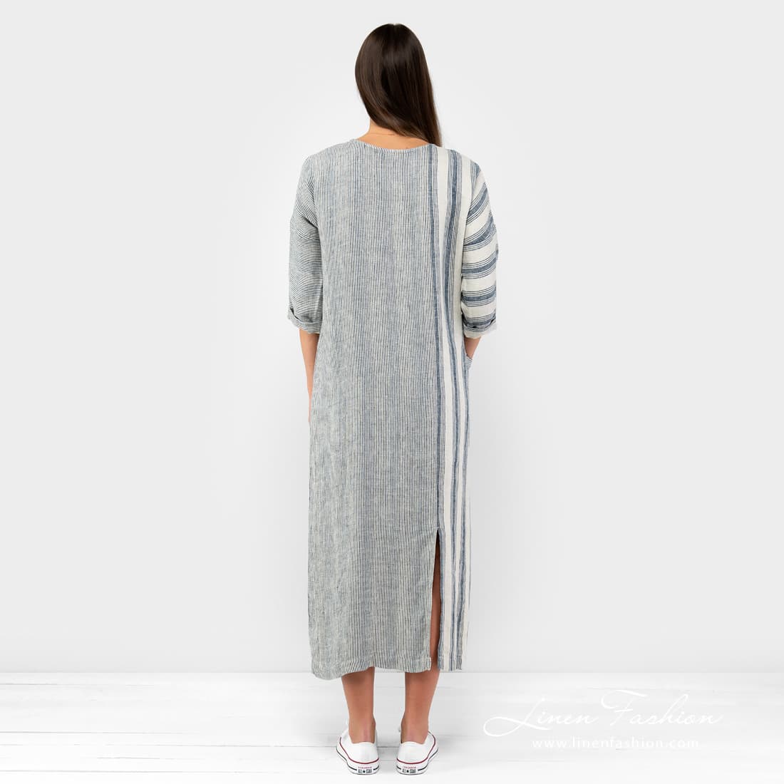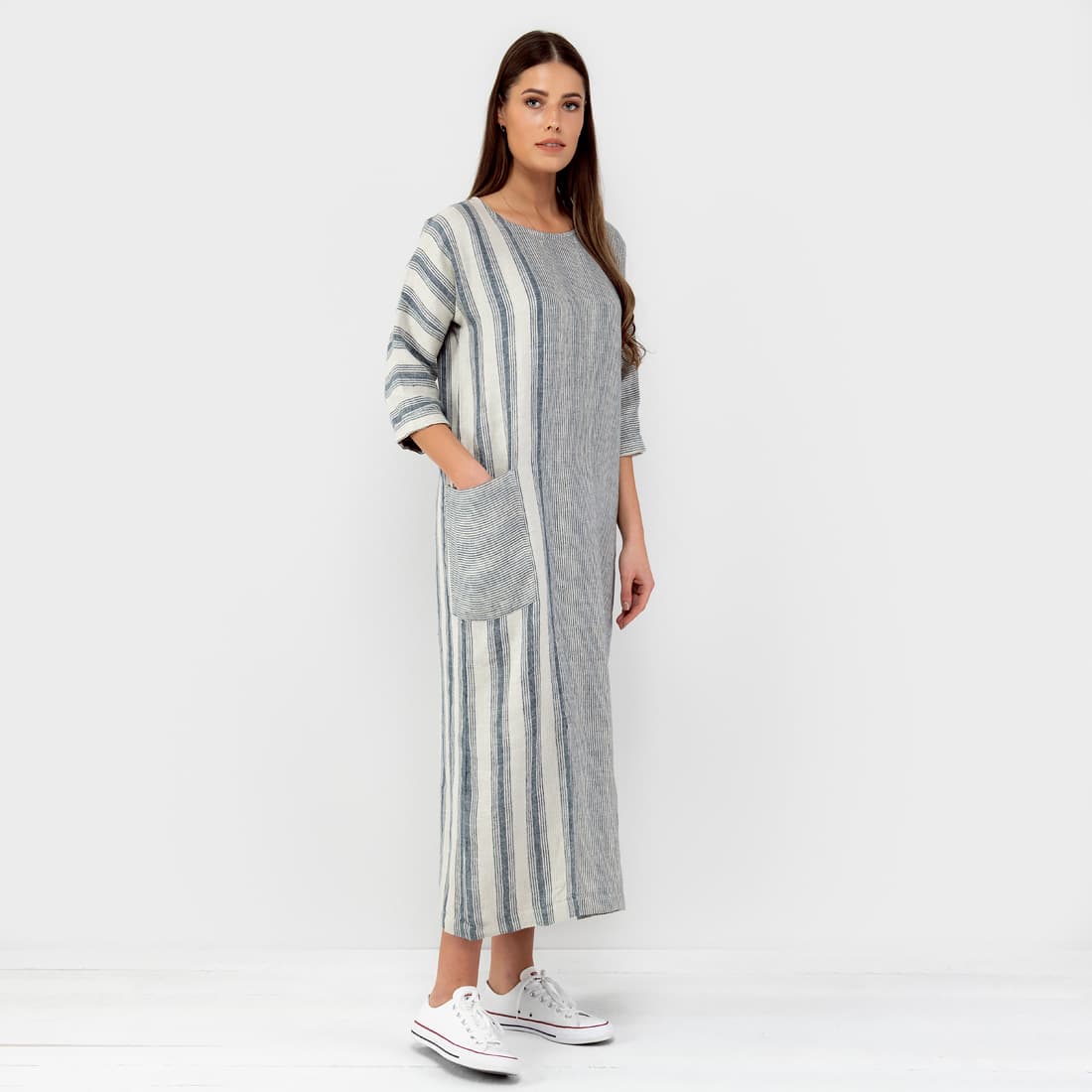 BERMUDA striped dress. Long linen dress sewn combining narrow and wider cream, grey coloured and navy vertical stripes.