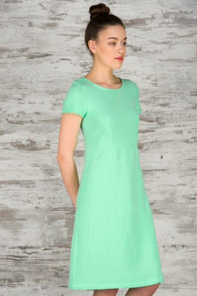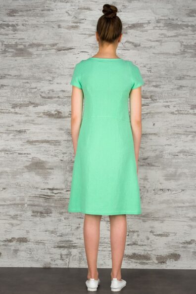 Short dress from mint (gently greenish) linen - cotton fabric. The design of this dress is quite simple, but the colour is flattering and impressive. Linen fabric will guarantee freshness in summer! In addition, it is woven in a delicate pattern. So the fabric is the most important component of this garment. If you like the youthful mint green colour, this dress for you!