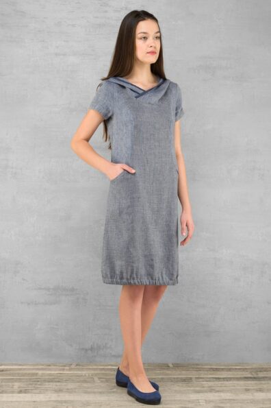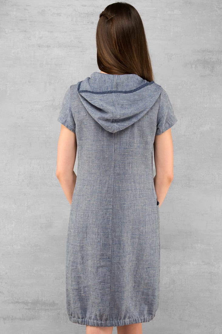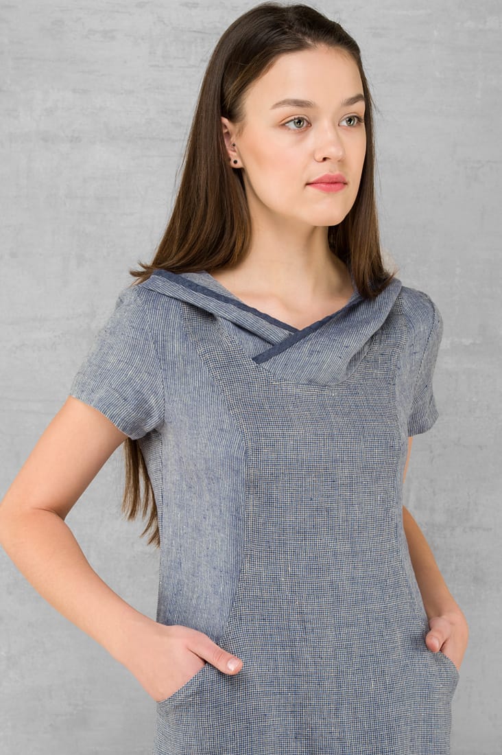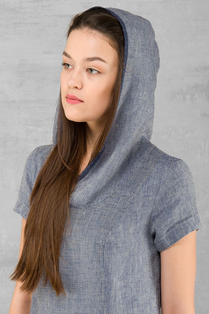 Linen dress sewn from dark blue and grey (natural linen colour, undyed yarns) checked fabric. Same colour finely striped pattern on sleeves, hood and side panels. You will feel and look great in this natural fabric dress.