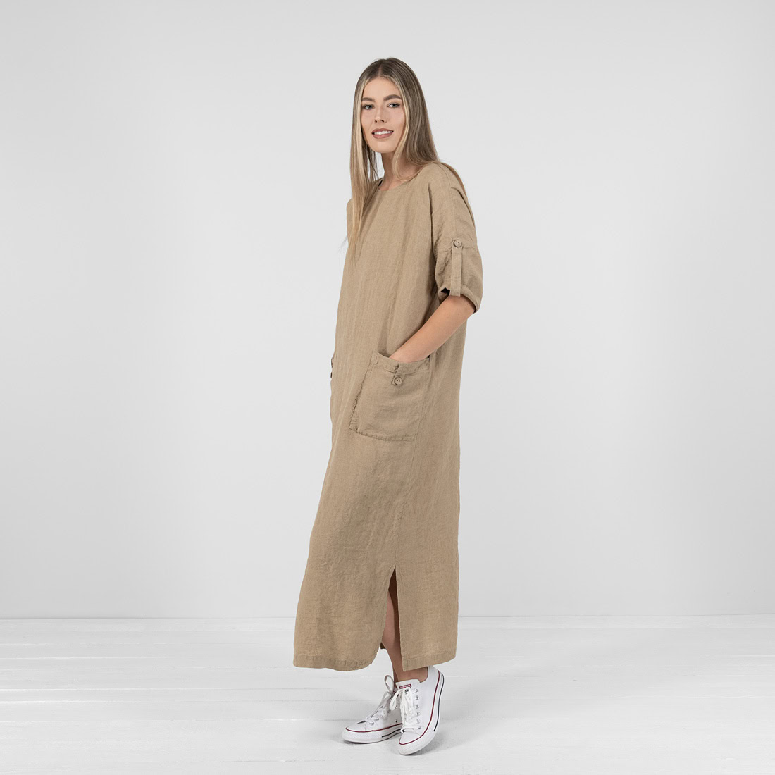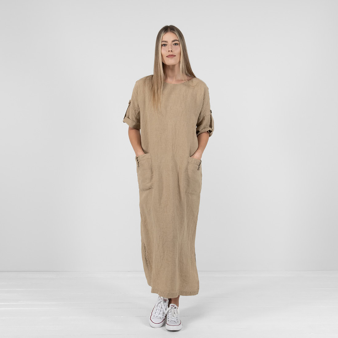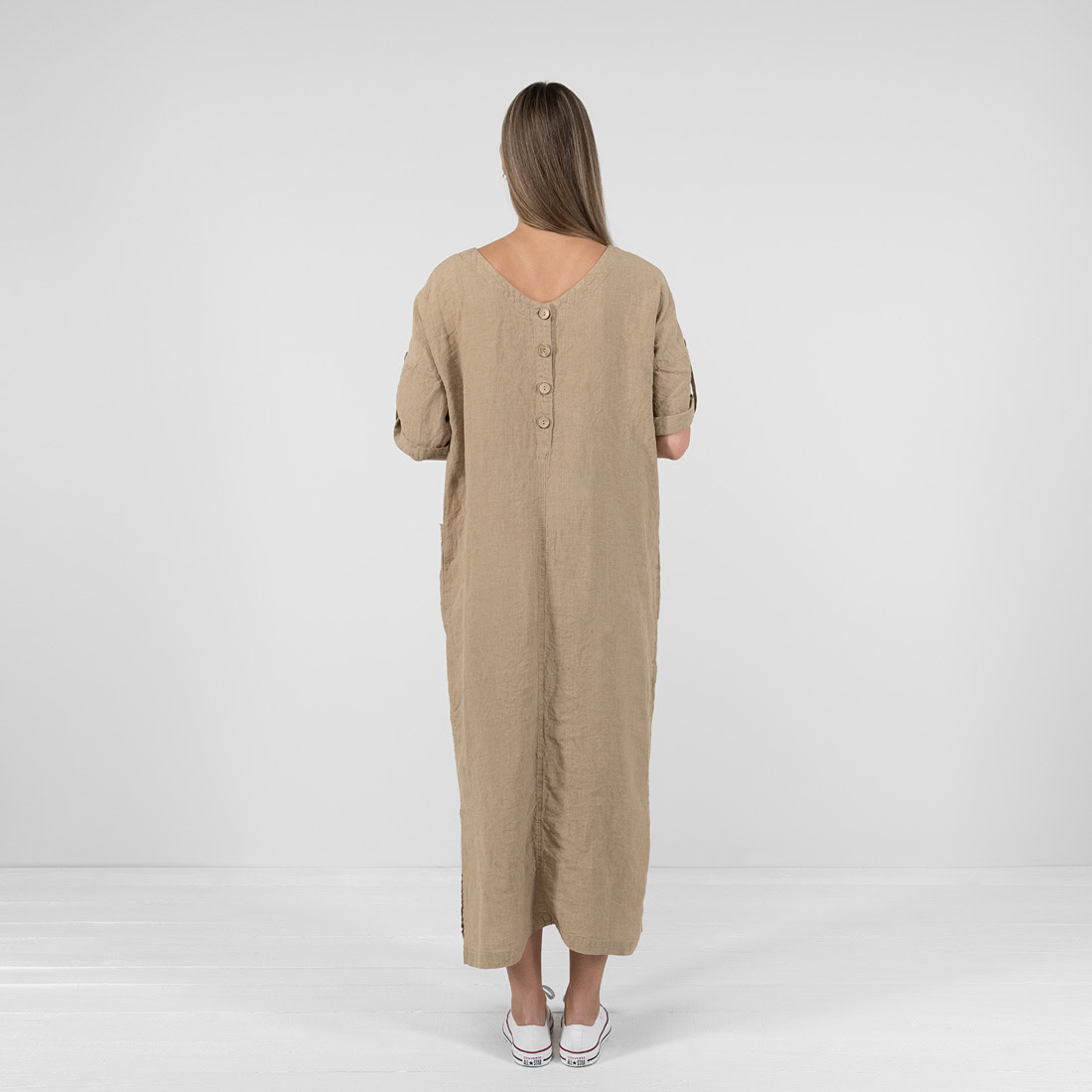- Product model: straight silhouette, loose fit, maxi-length, elbow-length sleeves with button fastening