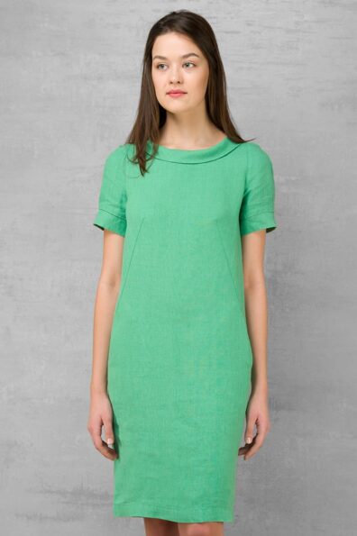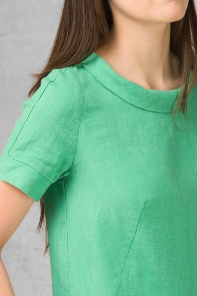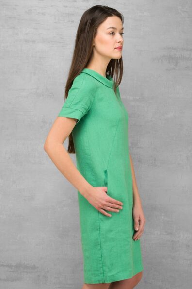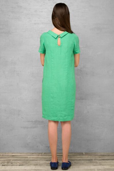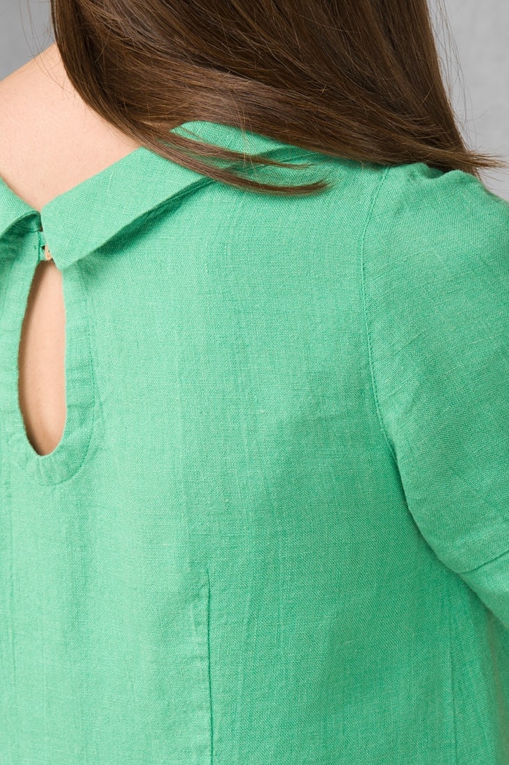 Linen dress is made of a single-colour green fabric. The back of the dress features a folding collar, V-shaped neckline, graceful keyhole detail with a button closure. Green colour will give a fresh and elegant look. This green dress will fit for any occasion.