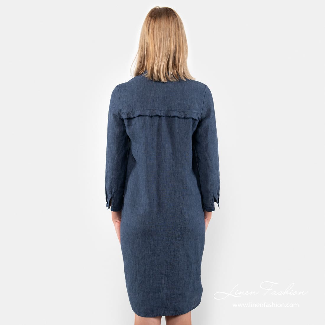 - Details: V-neckline, pockets, button placket, decorative ruffles on shoulders and back, rounded slits on sides