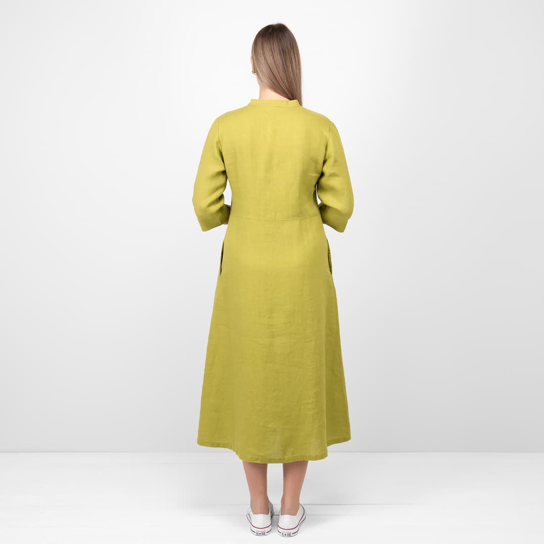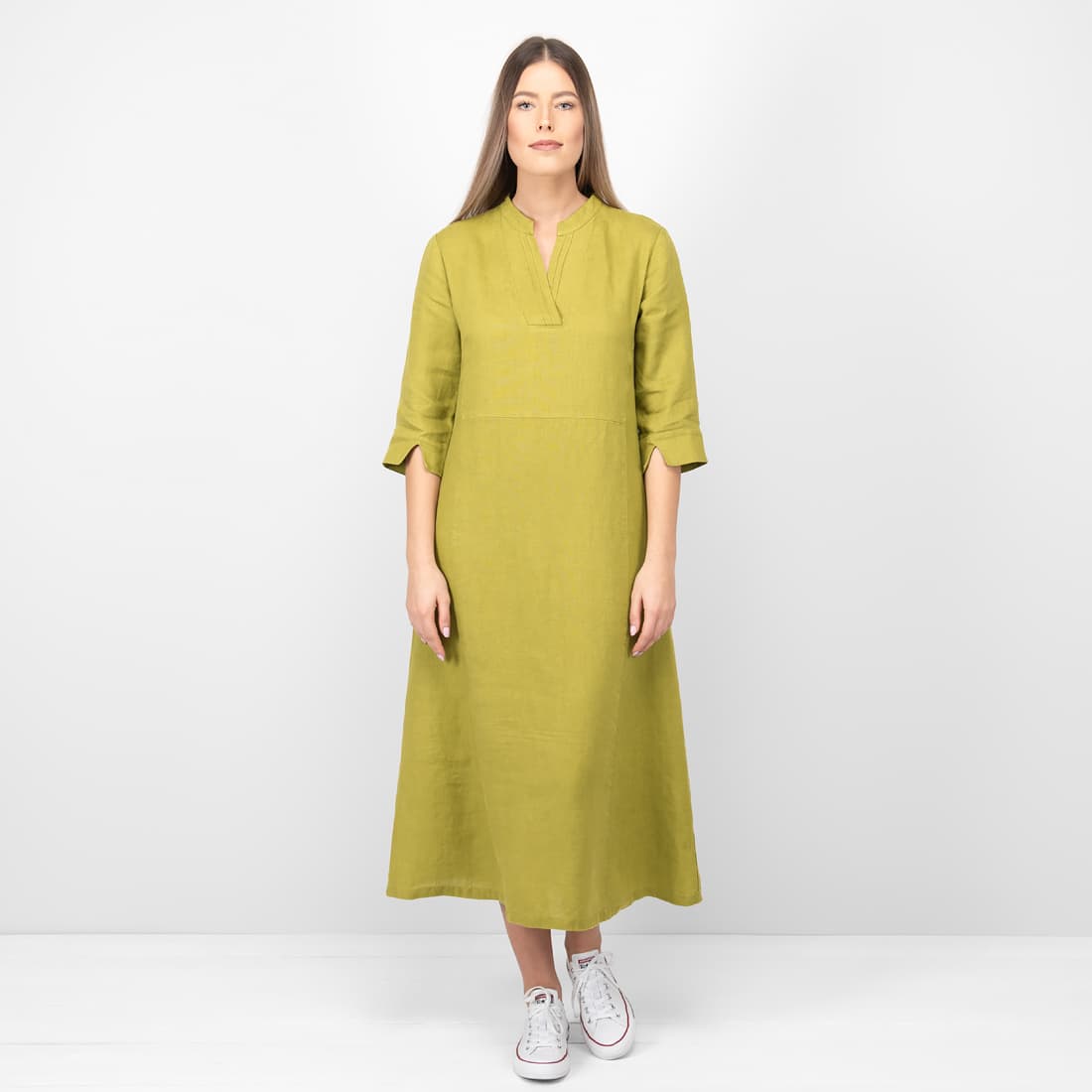 - Product model: A-line silhouette, midi-length dress, 3/4 sleeves with slits
