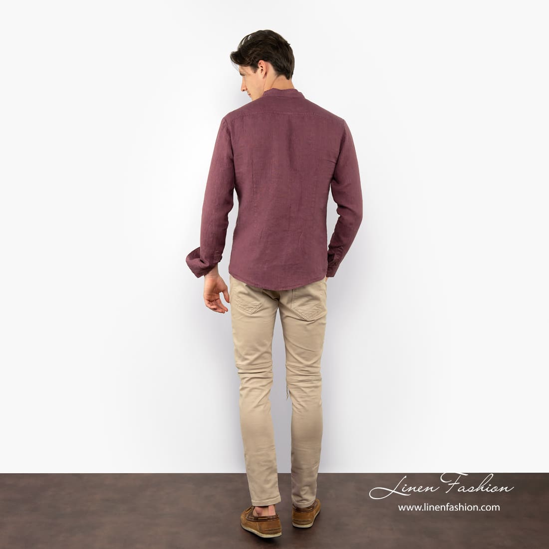 - Details: Narrow upright collar, press buttons, rounded bottom, pocket on the left side