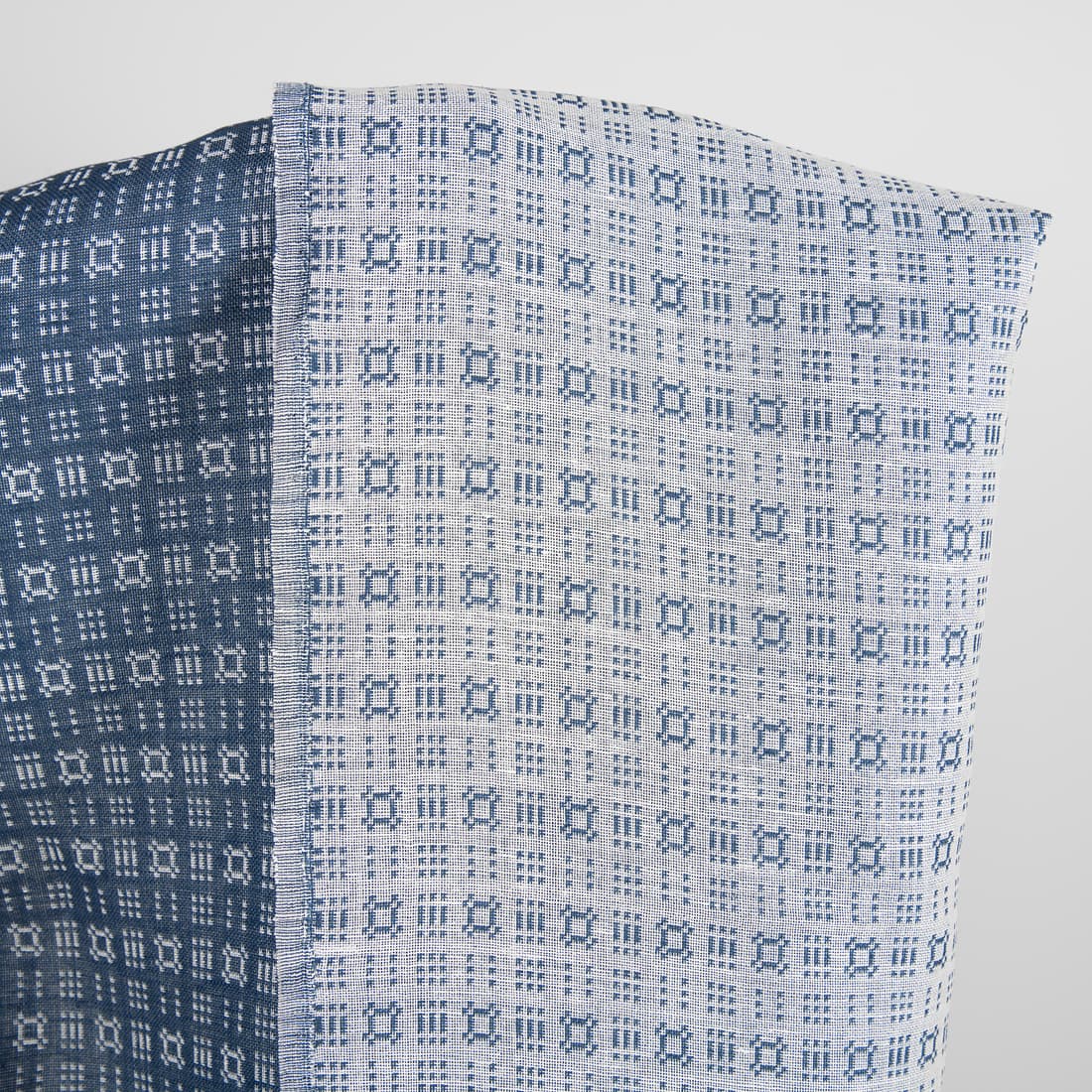 • Linen cotton fabric white and dark blue geometric pattern, double-sided