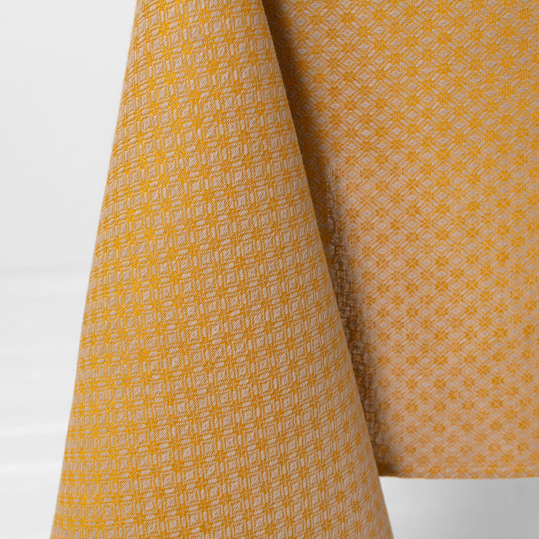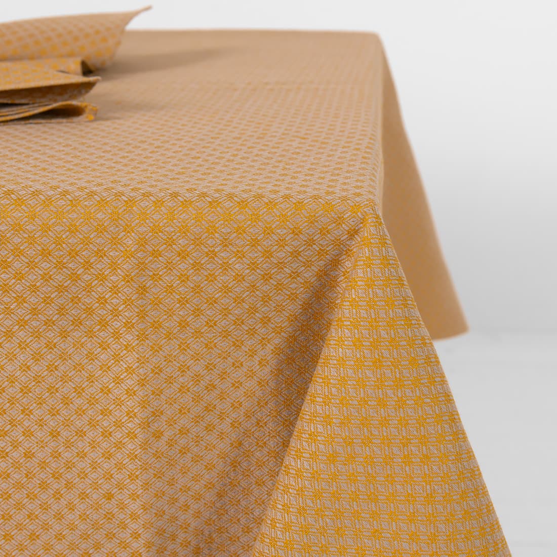 • Yellow tablecloth linen cotton, diamond pattern, with flower vase